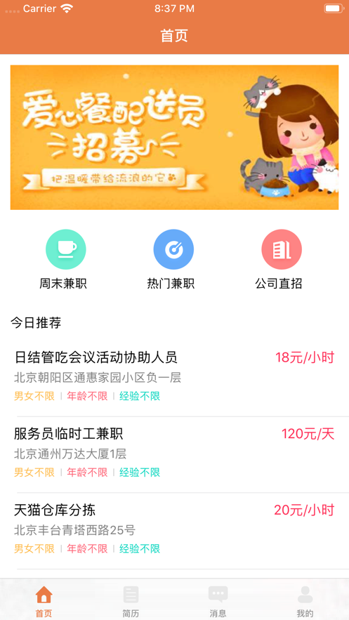 找兼职工作模式是用户找到合适的任务,然后在招聘信息中点击报名等待兼课招聘中商家的回复;