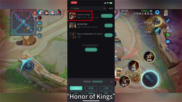 只需要在UU加速器APP的游戏界面上方搜索"Honor of Kings",选择自己的区服即可一键加速。