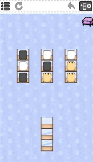 1.和不同种类的猫咪互动,并将它们进行分类,同种花色的猫咪都在一个沙发里面,将猫咪放到指定的位置,完成所有的猫咪的整理;