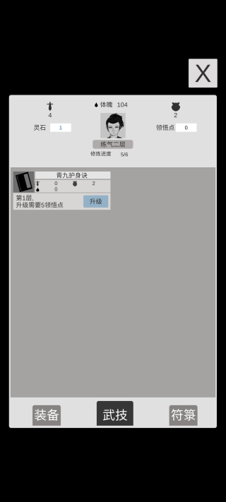 4、点击武技,可以查看习得的功法并使用感悟点升级