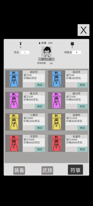 5、符箓,符箓界面可以购买各种符箓增强自身,需要花费灵石
