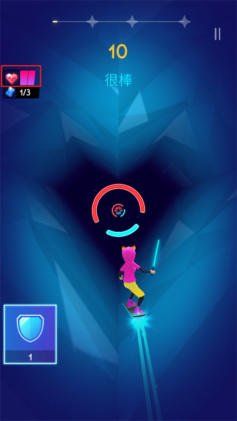 左上方的是血条,失误一次会消耗一格血条,血条见底游戏就会结束;