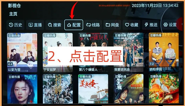 二、接着点击手机屏幕下方的配置字样,会出现配置仓库、线路和直播源的界面。
