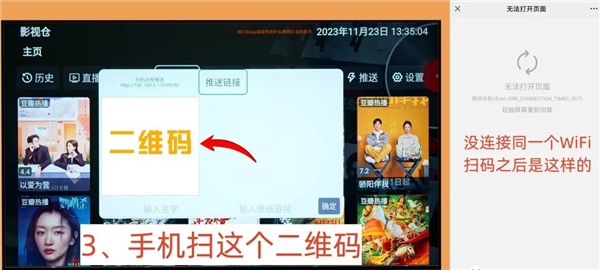 一、创建连接。拿出手机扫码(微信和浏览器的扫一扫都可以),电视和手机需要连接同一个WiFi,不然手机扫码会失败,打不开链接。