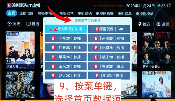 这个时候要按电视遥控器上的菜单键(就是三条横杠的那个按键),然后会弹出“请选择首页数据源”的窗口。更换数据源之后,可以看到主页界面已经变了,不同线路的数据源都不同,根据需要自己选择。