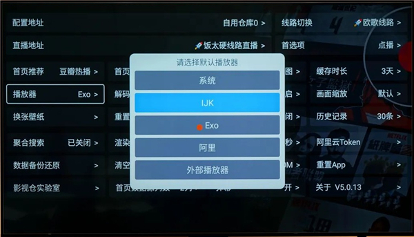 另外,在播放器设置这里,默认是Exo播放器,如果经常看直播的话,可以更换IJK播放器,因为Exo在直播方面稍微差一点,不过日常观影的话,可以选择Exo播放器。