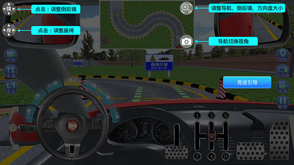 正式开始练车之前,还会有一段操作引导教程,点击【完成引导】后即可开始测试。