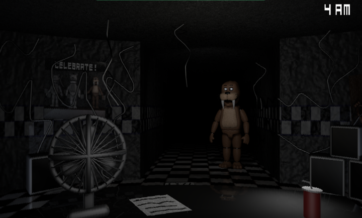 一个浑身被拆毁的玩偶,每移动一次会发出信号被干扰的声音,会路过正门,不过正门无危害性,当你在右管道闪灯看见时,立马戴头套,听见噪声和嗵嗵声(应该)代表她离开,若没及时戴头套或她在时开了监控,她会爬到天花板上,一直戴头套可以延缓跳时间,但再所难逃,你也还可以上几次发条,如果时间不是5点还是退了吧;