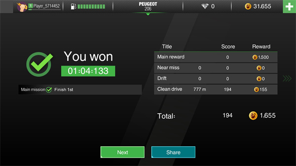 每完成一个任务都可以获得大量的金币,同时还可以看到自己的赛车时间;