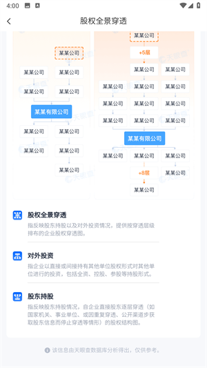 关系图谱:基于天眼查图数据库,天眼查可实现任一主体(企业或个人)的所有关联体的呈现。通过可视化图谱,用户可以直观了解复杂的商业关系网络。