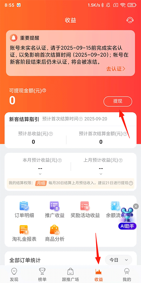 获得的佣金可以在APP【收益】页面进行查看并提现。