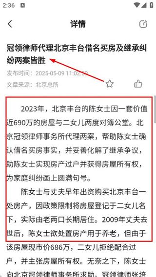 在房产纠纷页面点击目标案例,进入该案例的详情页面。