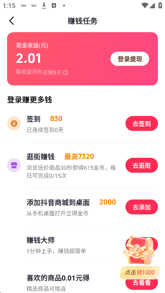 2、在这个界面有许多红包任务,完成即可获取金币,金币可以兑换现金
