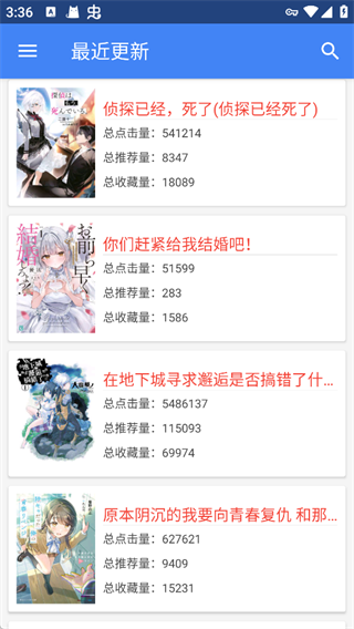 打开轻小说文库App后,即可在首页看到多部热门轻小说作品,并配有点击量、推荐量等数据,方便快速筛选感兴趣的内容。