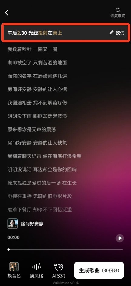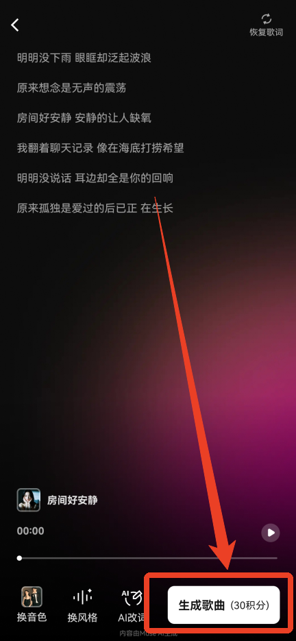 完成之后,点击右下方的生成歌曲就可以了,需要消耗30积分。