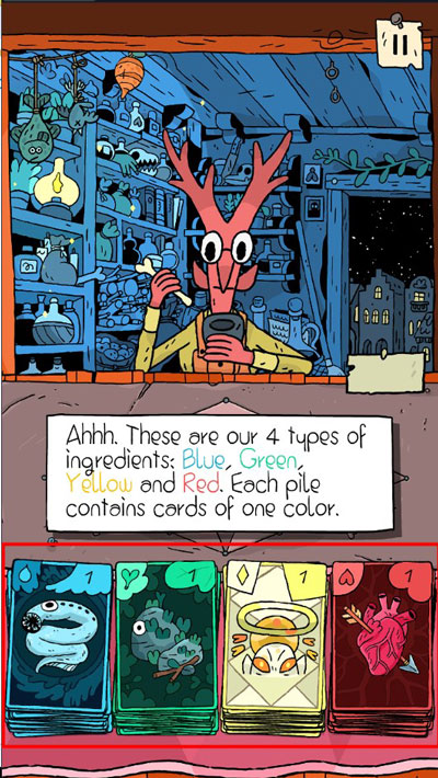 游戏中一共有蓝色、绿色、黄色、红色四种类型的成分,组合四种成分的卡牌就能创造需要的魔药