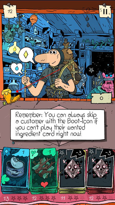 每一位客户的订单都是不同的,上方的气泡里显示的就是他需要的药剂成分,下方的气泡则显示他真正喜欢的成分,你至少需要使用一张他需要的成分卡牌
