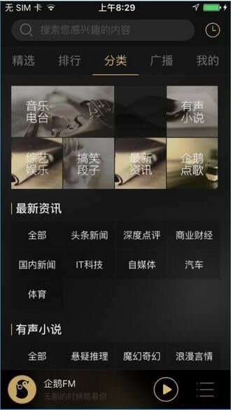 进入分类页面,用户可以根据各种分类进行查看直播,同时还有最新最热的一些资讯及有声小说等信息哟。