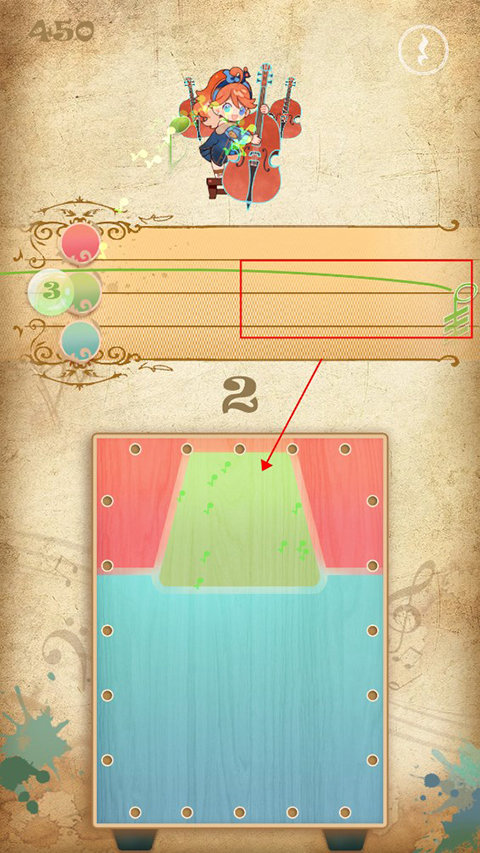 游戏玩法以三色演奏为主,上方会出现音符,玩家需要点击下方对应颜色收集音符,也可以根据鼓声节奏来击鼓。