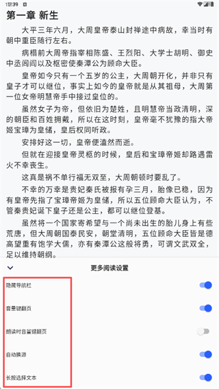 向下滑动还可以调整音量键翻页、朗读时音量键翻页、自动换源、长按选择文本等设置。