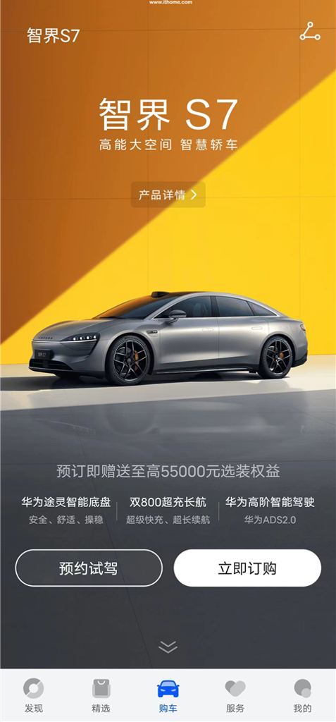 3、购车版块可以预约试驾、订购车辆,目前仅有智界 S7,还提供专属购车顾问电话;