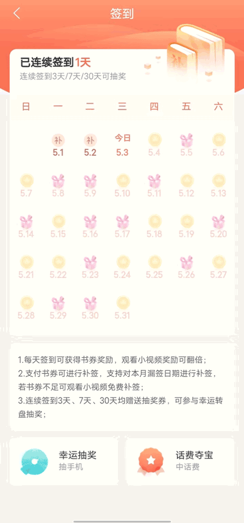 支付书券可进行补签,支持对本月漏签日期进行补签若书券不足可观看小视频免费补签;