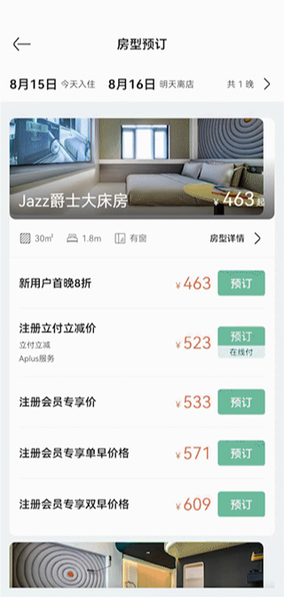 选择好酒店再点击【选择房型】进入房型选择界面,点击一个价格进入详细的房间界面,最后点击【提交订单】就可以预定好房间了。