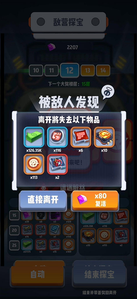 在每一轮敌营探宝玩法中,特工都拥有三次免费复活的机会,观看广告即可免费复活。当三次免费复活次数用尽后,特工可选择支付钻石进行复活,首次复活费用为80钻石,后续复活价格将不断增加。
