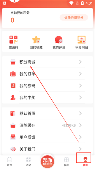 点击【我的】,选择【积分商城】