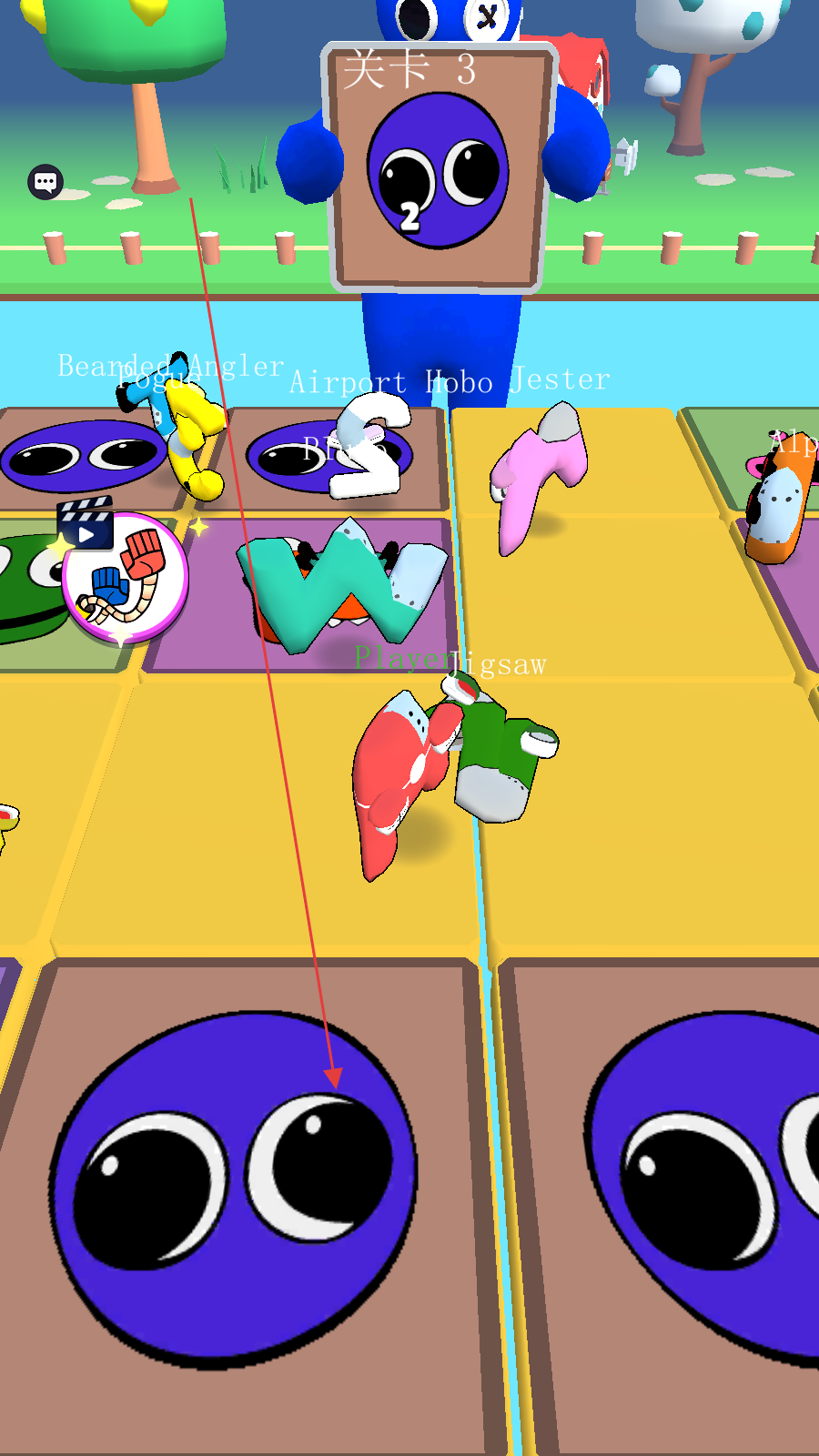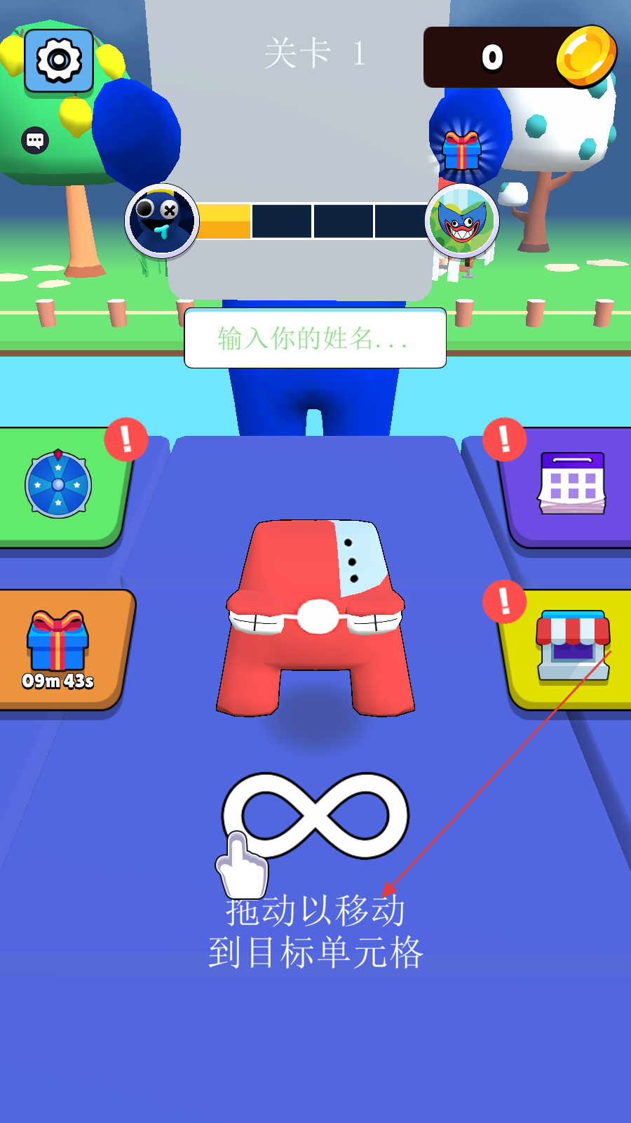 查看怪物拿起的方格,拖动角色到目标方格,不要让角色掉落。