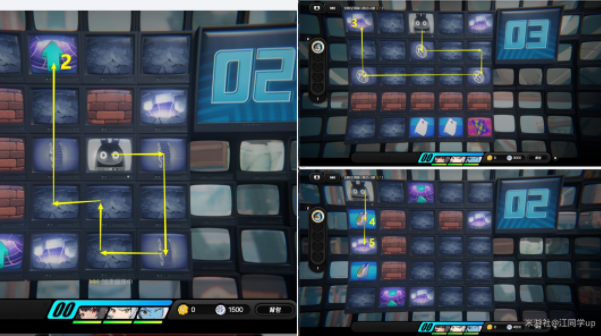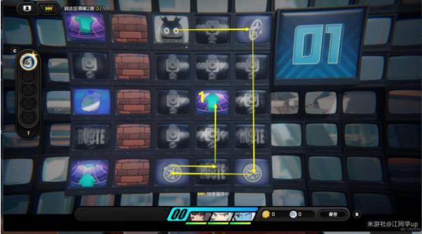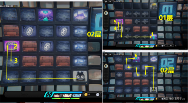 2、到02层后,先去拿了2区域宝箱,接着返回下面3区域,就会从02层的3区域掉回到01层的4区域,然后上面拿了5区域宝箱后,再去1区域传送回到02层,接着按照下图路线去7区域传送到03层,注意02层的每个格子只能走一遍,走第2遍就会掉回到01层;
