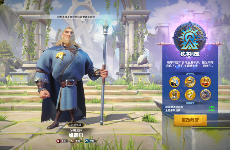 秩序同盟的阵营加成为魔法防御力加成与采集速度加成,两个加成都比较实用,魔法防御力加成在有着大量法师队的S1赛季有着很好的表现,采集速度加成也可以帮助我们快速发育,尽快拥有一战之力。