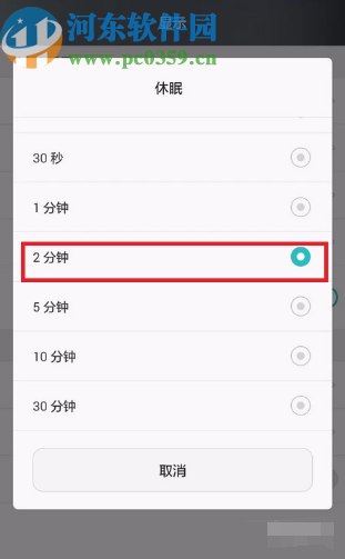 3.点击之后在手机的界面下方就会出现让我们选择屏幕休眠时间的界面了,然后我们将30秒更换为2分钟,然后点击空白处即可保存选择操作。