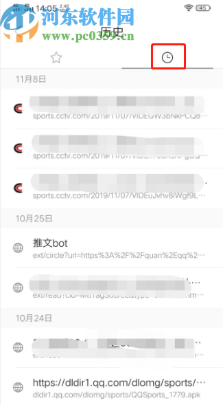 3.下一步就是进入到QQ浏览器的书签/历史界面了,然后我们需要先将界面从书签模块中切换到历史模块界面中,点击界面中的这个时钟图标即可。