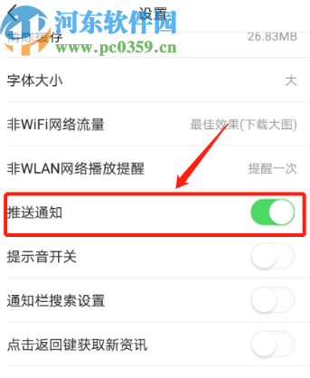 3.点击进入到系统设置界面之后我们就可以在其中看到推送通知这个功能了,此时开关是开启的状态。