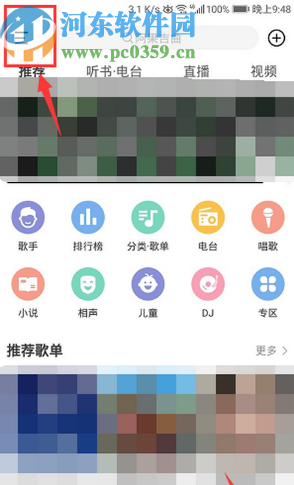 1.首先第一步我们打开酷我音乐APP主界面之后点击界面左上角的三条横线图标,如下图中所示。