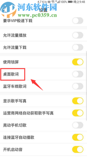 3.进入到设置界面之后我们就可以看到桌面歌词这个功能了,然后需要点击它的开关将功能开启。