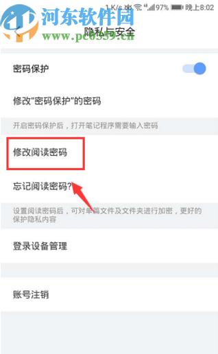 3.点击进入到隐私与安全这个设置界面之后,我们在其中找到修改阅读密码这个选项,找到之后点击进去。