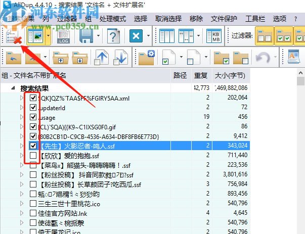 4.点击开始查找按钮之后会进入到查找文件的界面,等到查找完成之后我们在界面中就可以看到搜索出来的重复文件的搜索结果了,然后我们点击选中要进行删除的文件之后再点击左上角的红色叉图标。