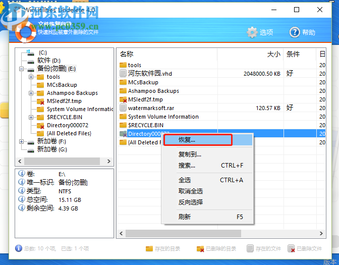 4.然后我们找到已删除的目录或者已删除的文件,需要恢复的就用鼠标右键点击它,然后在出现的选项中选择恢复并点击。