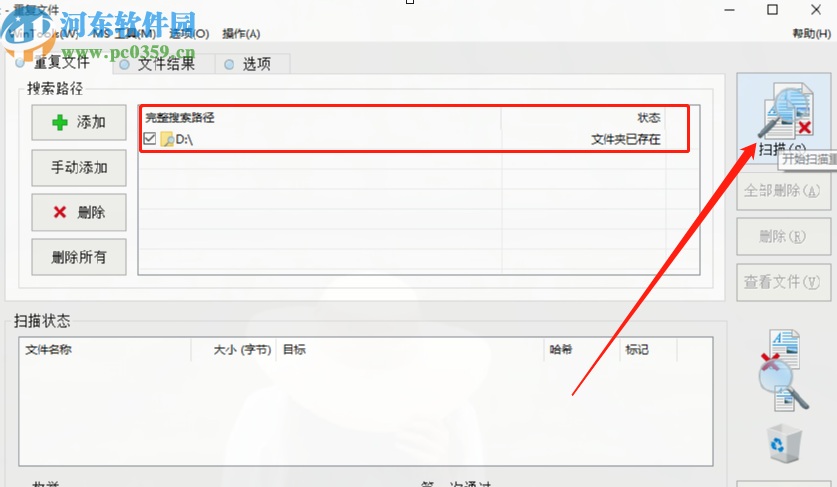 1.首先第一步我们打开软件之后在软件的左边界面中点击切换到重复文件这个功能界面,然后在重复文件中点击添加按钮。