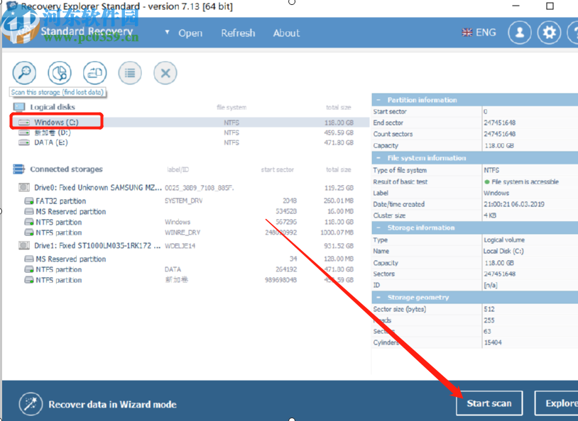 1.首先进入到软件之后的第一步就是选择好我们要扫描恢复文件的磁盘,选择完成之后点击界面右下角的Start scan这个开始扫描按钮。