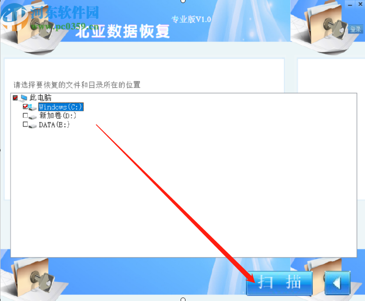 2.进入到恢复删除文件的功能界面之后,需要先选择要扫描恢复删除文件的磁盘,勾选目标磁盘之后点击右下角的扫描按钮。