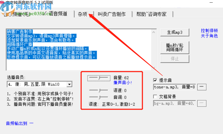 3.设置完成语音播音员之后,下一步可以调整语音的音量、语速、音调等参数,调整完成之后点击上方的杂项这个功能选项。