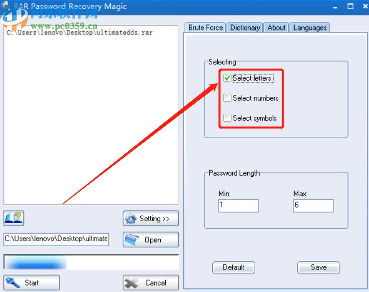 3.点击打开按钮之后下一步就是需要在界面的右边设置密码的相关参数,在暴力破解这个界面中点击选择字母、数字、符号。