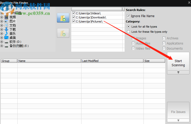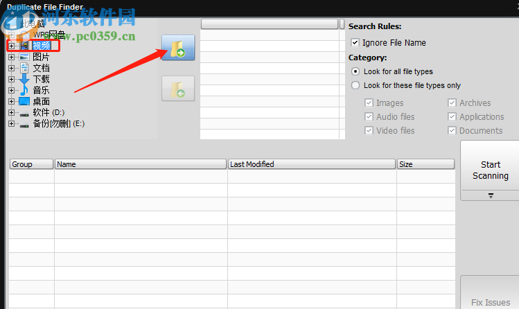 2.进入到扫描重复文件界面之后,在界面左上方选择要扫描的文件夹或磁盘,然后点击向右的箭头图标,将选中的文件添加到扫描列表中。