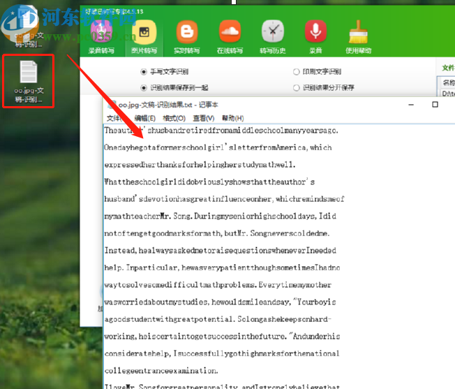 4.点击开始识别按钮之后等待一会在界面下方就可以看到识别完成的提示了,识别之后的结果会保存到电脑桌面上,有Word文档和TXT文档两个文件。