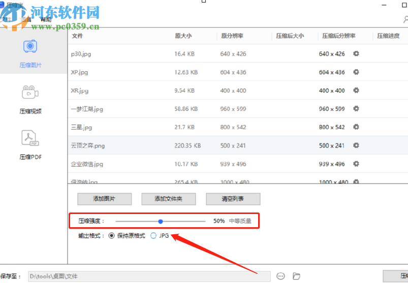 4.设置好图片分辨率之后,下一步我们就可以在界面下方设置压缩强度以及压缩输出的格式了,大家根据自己的需求选择即可。