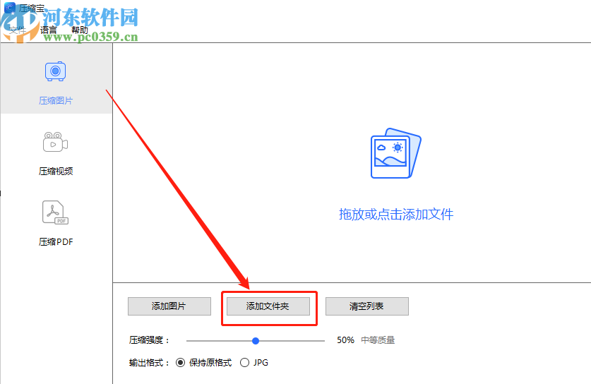 1.首先第一步我们打开软件之后在软件的主界面中点击切换到压缩图片功能界面中,然后点击界面右下角的添加文件夹按钮。