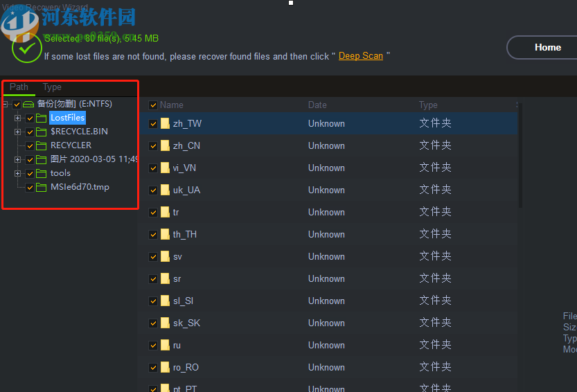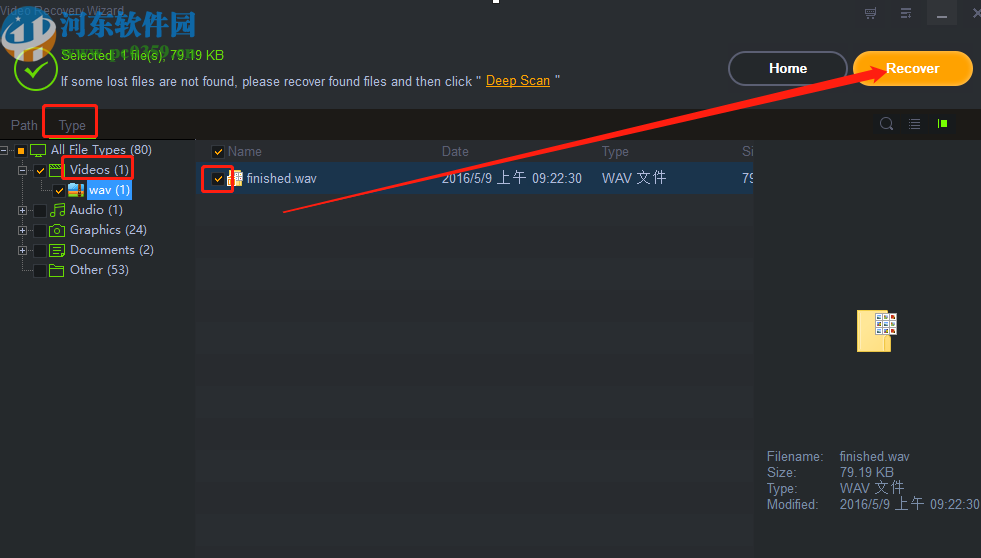 5.点击找到储存视频的文件夹之后,勾选自己想要恢复的视频文件,然后点击界面右上角的Recover这个恢复按钮即可开始恢复选中的视频文件。